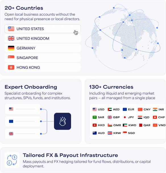 Establish local bank accounts in key global markets like the UK, US, EU, and Singapore, complete with domestic clearing details, all managed from your UAE headquarters.